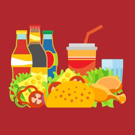 インスタント食品 半製品のイラスト 写真の簡単なスナックの様々 な屋台の食べ物 高品質の製品のためにベクターの画像は明るい色 のイラスト素材 ベクタ Image
