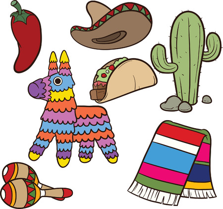 メキシコのシンコ デ マヨのお祝い アイコンセット デザイン要素 フラットスタイル サンブレロ テキーラ サボテン 赤いホットチリペッパーギター マラカスとシンコデマヨパレードのためのコレクションオブジェクト ベクトルイラスト クリップアートのイラスト