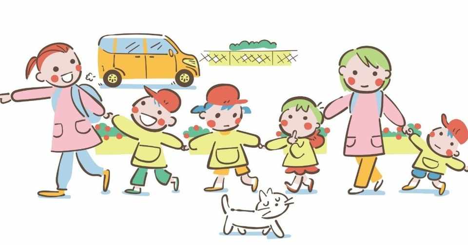 先生と一緒にお散歩する保育園または幼稚園の子どもたちのイラスト 無料 Gogon Note